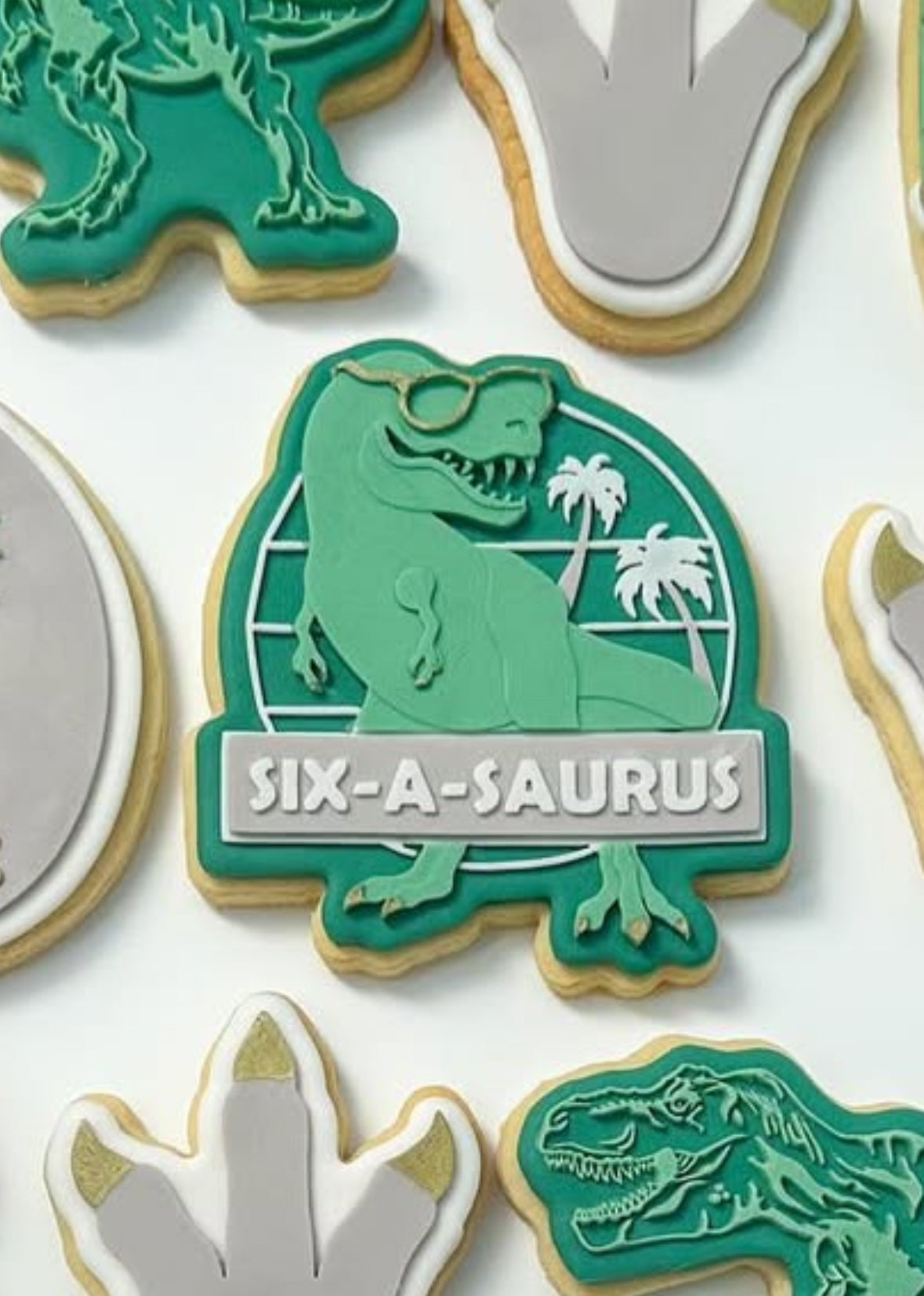Such a fun way to add a personalised touch to a spunky 6yr olds Dinosaur themed celebration. Please add what name you are requiring in the notes upon checkout. This stamp is 8.6cm x 9.5cmcm in size. Comes with a matching cutter. Please remember to hand wash only in warm water.